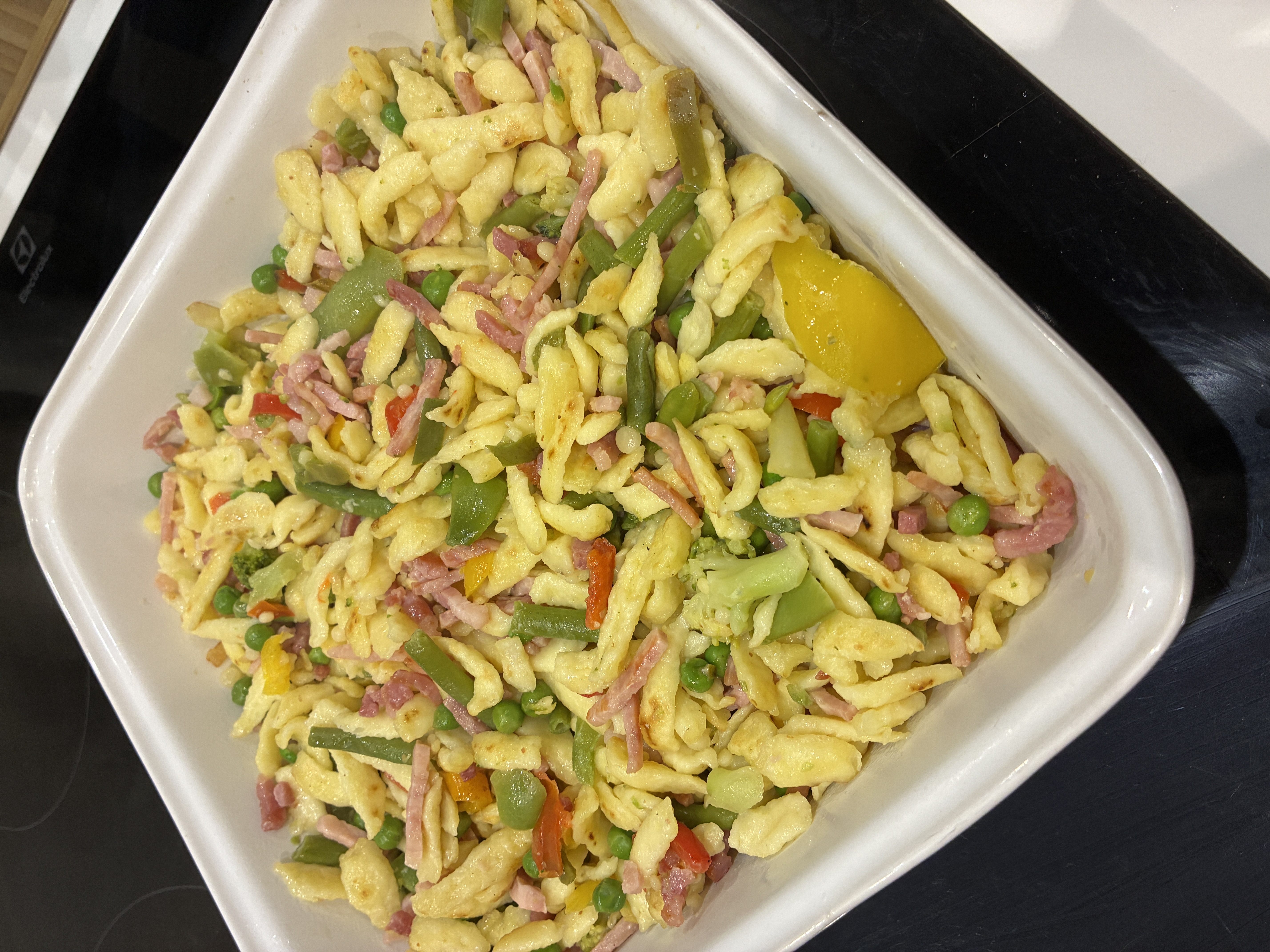 Très bonne expérience avec les spaetzle déjà point positif sa permet de goûter autre chose que des pâtes et d'y retrouver du moelleux et du croustillant en même temps ses très ingénieux par contre je serais tenté qu'ils fassent des spaetzle au fromage sa serais sympa .