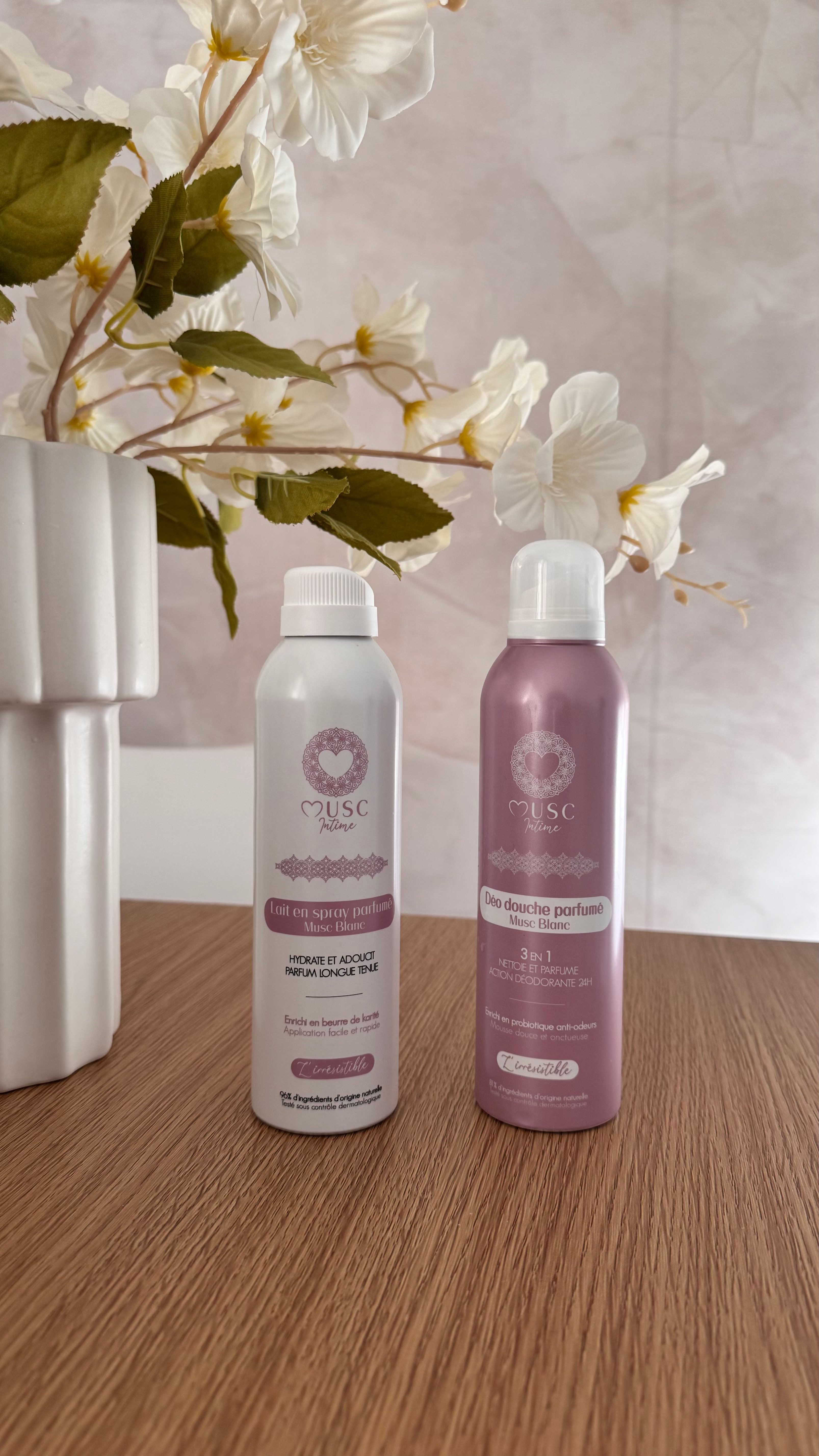 Très satisfaite de ce duo Musc Intime ! Le gel douche laisse une vraie sensation de propreté et de douceur, avec une odeur de musc très agréable. Le lait en spray complète parfaitement : il parfume délicatement et laisse la peau douce sans coller. Quelques petits points à améliorer comme la tenue du parfum ou un format un peu plus grand, mais dans l’ensemble c’est une très belle routine. Je recommande !
