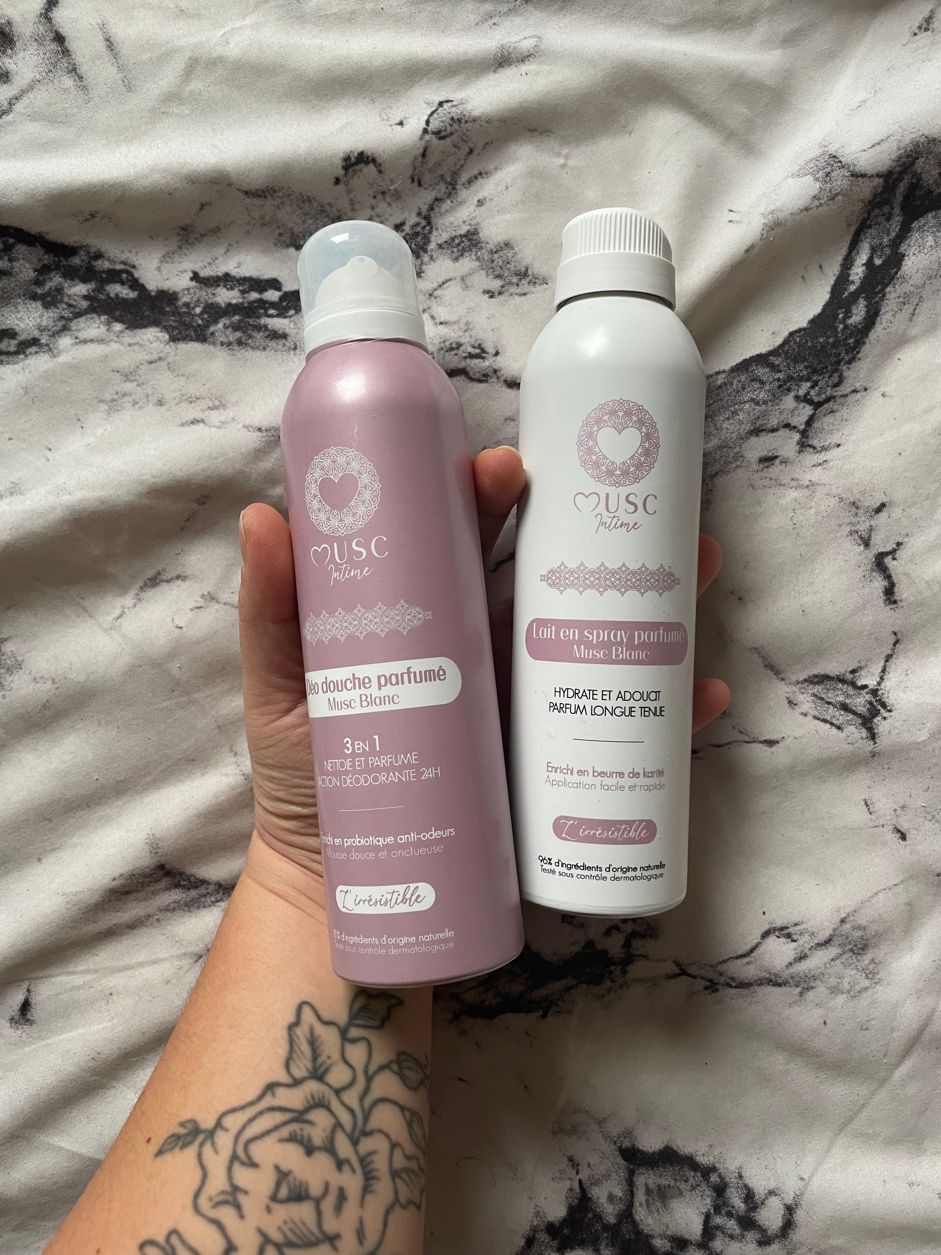 Je n’avais jamais testé Musc Intime et j’adore, l’odeur reste super longtemps sur le corps les produits sont pratiques d’utilisation. La texture du déo douche est incroyable sur la peau et le lait en spray ne laisse aucun fini gras. L’odeur reste durant toute la journée.